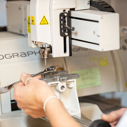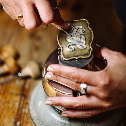 Mit feinem Stichel wird Ihr Wunschmotiv von Hand gestochen – sei es ein Familienwappen, ein Monogramm oder eine Widmung auf Silber, Besteck oder Schmuck.