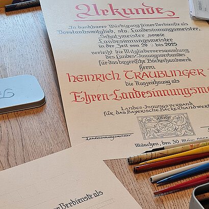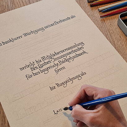 Mit Tusche, Feder und Kreide gestalten wir individuelle Zierschriften. Ob Urkunden, Widmungen oder festliche Schriftzüge – unsere Kalligraphie wird von Hand mit großer Sorgfalt und Liebe zum Detail ausgeführt.