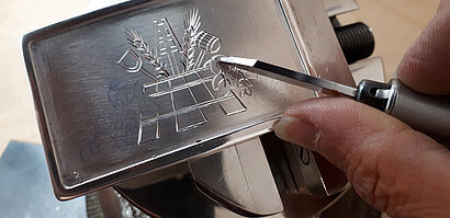 Mit feinem Stichel wird Ihr Wunschmotiv von Hand gestochen – sei es ein Familienwappen, ein Monogramm oder eine Widmung auf Silber, Besteck oder Schmuck.
